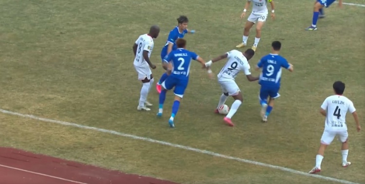 第25分钟,南京城市右路下底传中,无人盯防的队友后点凌空抽射踢飞。↓