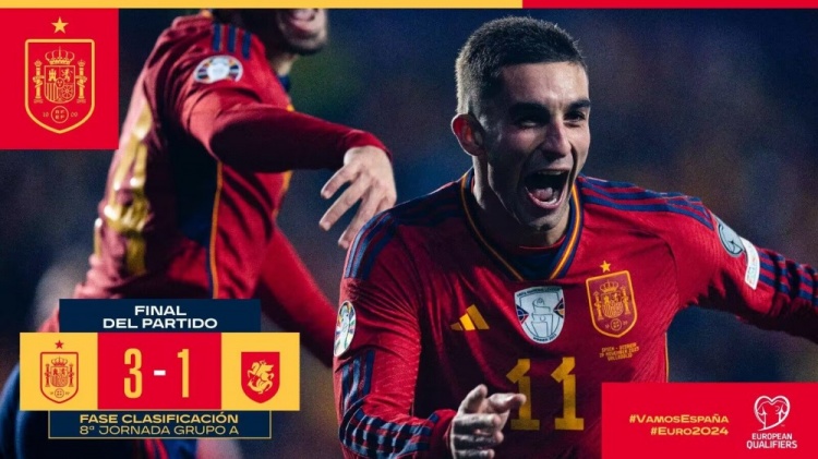 11月20日讯 北京时间11月20日凌晨3:45,欧洲杯预选赛A组第10轮,西班牙主场迎战格鲁吉亚。上半场勒诺尔芒头球破门,克瓦拉茨赫利亚扳平比分,加维伤退;下半场费兰-托雷斯建功,亚马尔传中造成科乔什维利乌龙球,最终西班牙3-1格鲁吉亚,六连胜收官,小组第一出线。