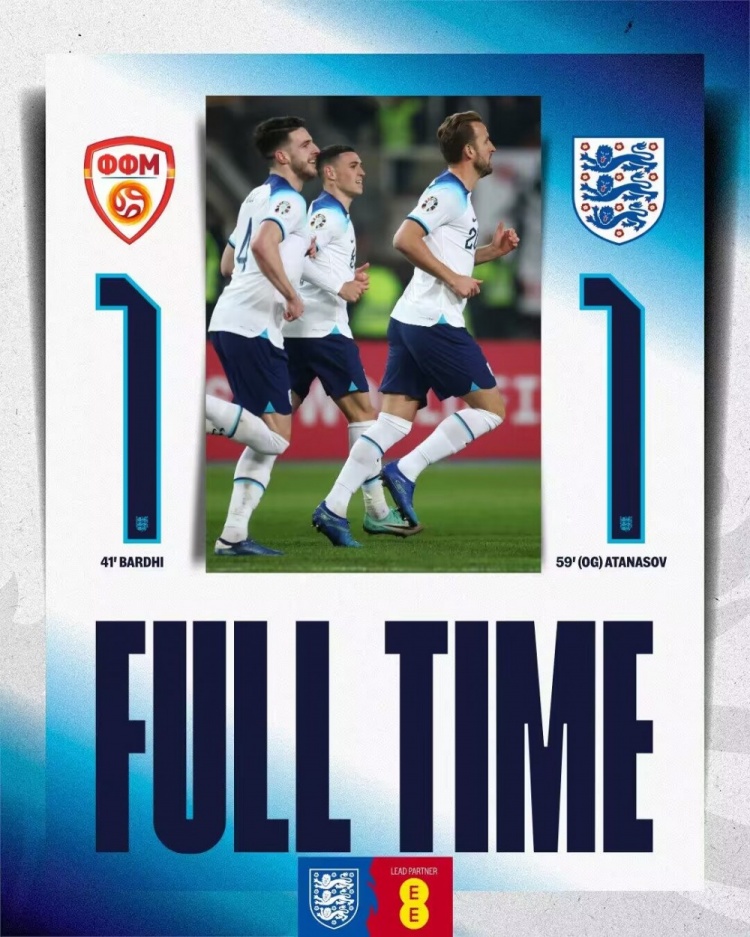 欧预赛-英格兰1-1北马其顿头名出线 凯恩造乌龙里科-刘易斯送点