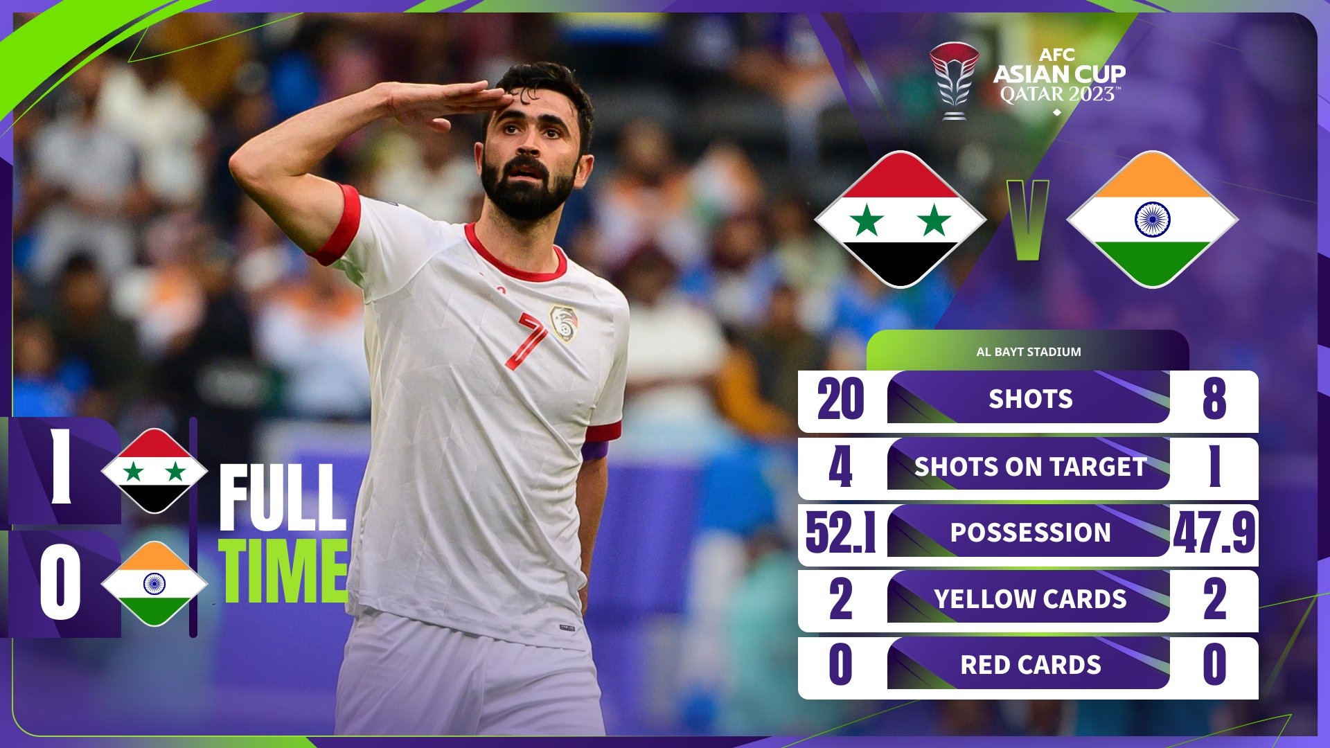 下半场补时7分钟,叙利亚1-0印度。