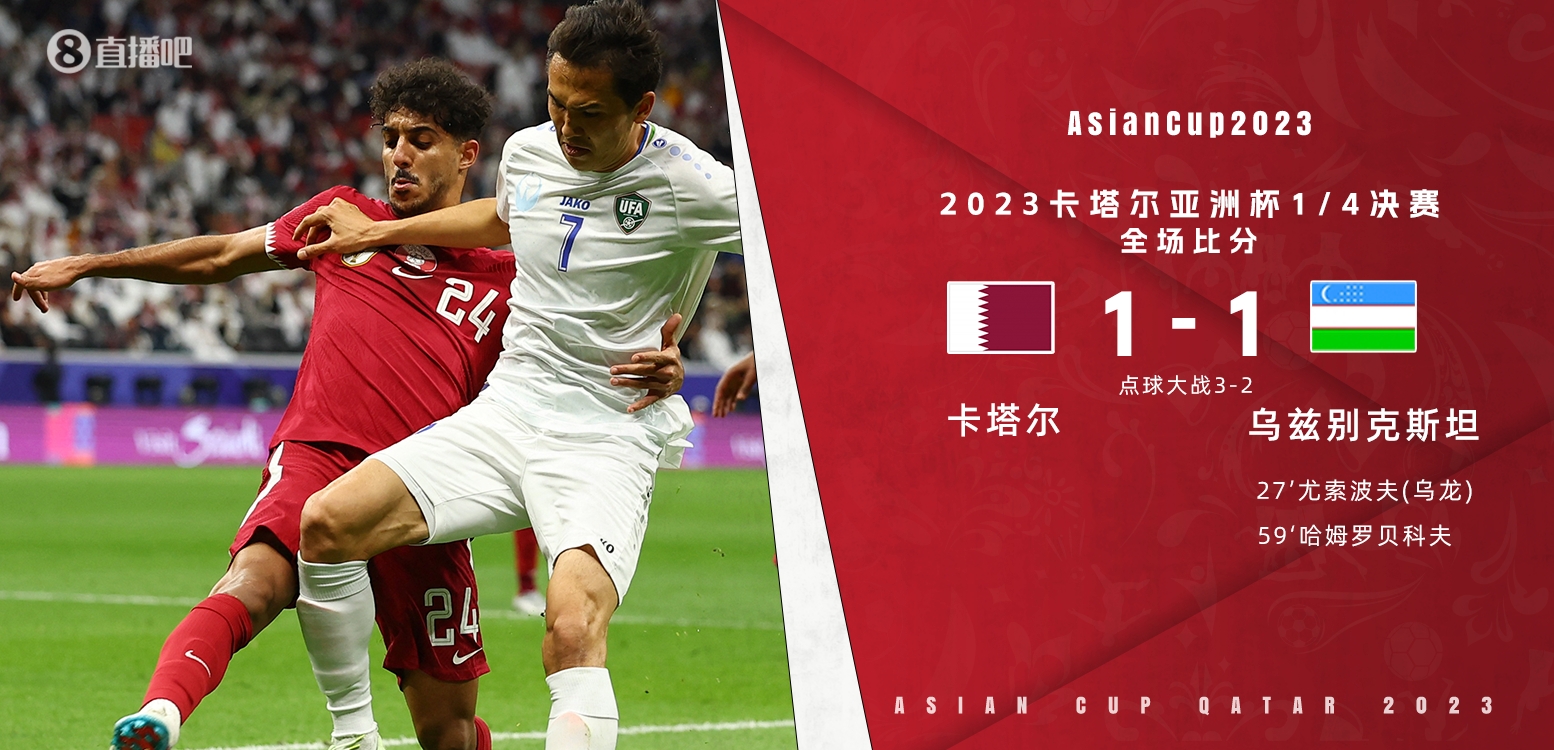 全场比赛结束,卡塔尔4-3乌兹别克斯坦。