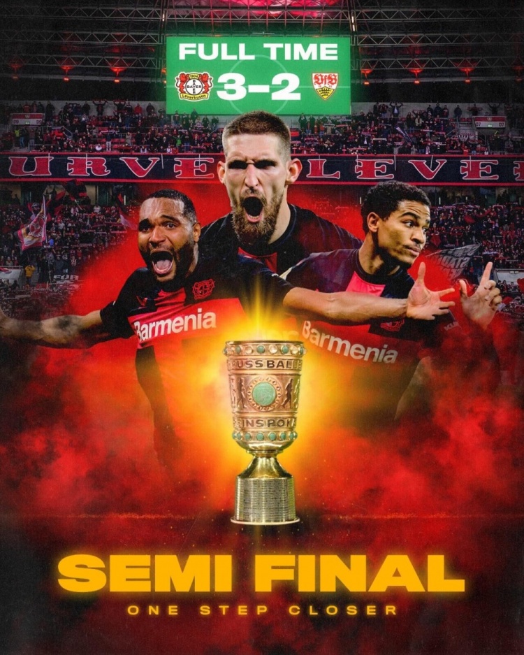 德国杯-勒沃库森3-2逆转绝杀斯图加特进4强 药厂各赛事30场不败