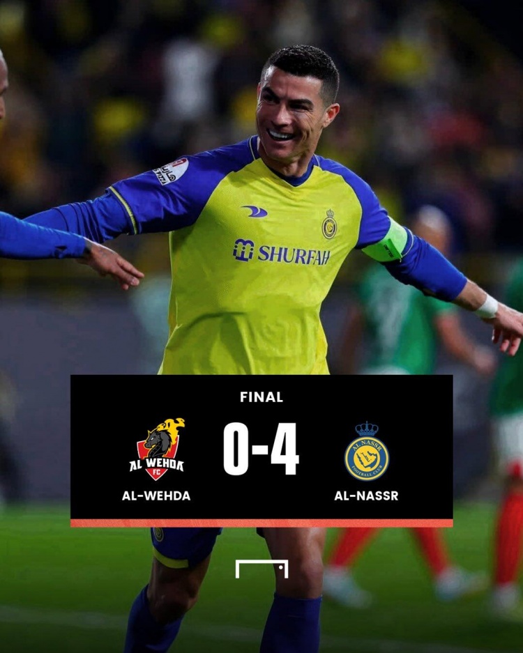 2月10日讯北京时间2月10日凌晨1:30,沙特联第16轮,利雅得胜利客场对阵瓦赫达麦加。上半场,罗德里格斯中柱,C罗上演梅开二度为利雅得胜利取得领先。下半场,巴克什文手球送点,C罗主罚命中,随后C罗单刀再入一球上演大四喜!全场比赛结束,利雅得胜利4-0瓦赫达麦加!