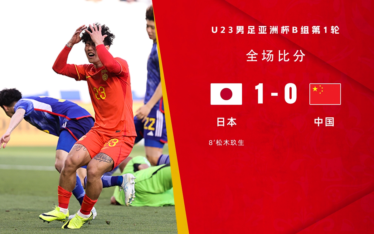 4月16日讯 北京时间4月16日晚上21:00,U23亚洲杯小组赛B组第1轮,中国U23对阵日本U23。上半场,松木玖生包抄破门,西尾隆矢肘击贾非凡染红,陶强龙中框。下半场,谢文能失单刀,国奥多打一人但没打出优势。全场结束,中国U23以0-1十人日本U23。
