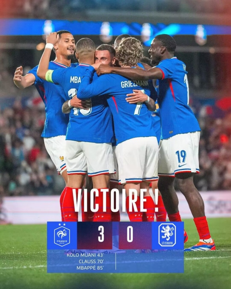 友谊赛-法国3-0卢森堡 姆巴佩1射2传独造3球穆阿尼、克劳斯破门