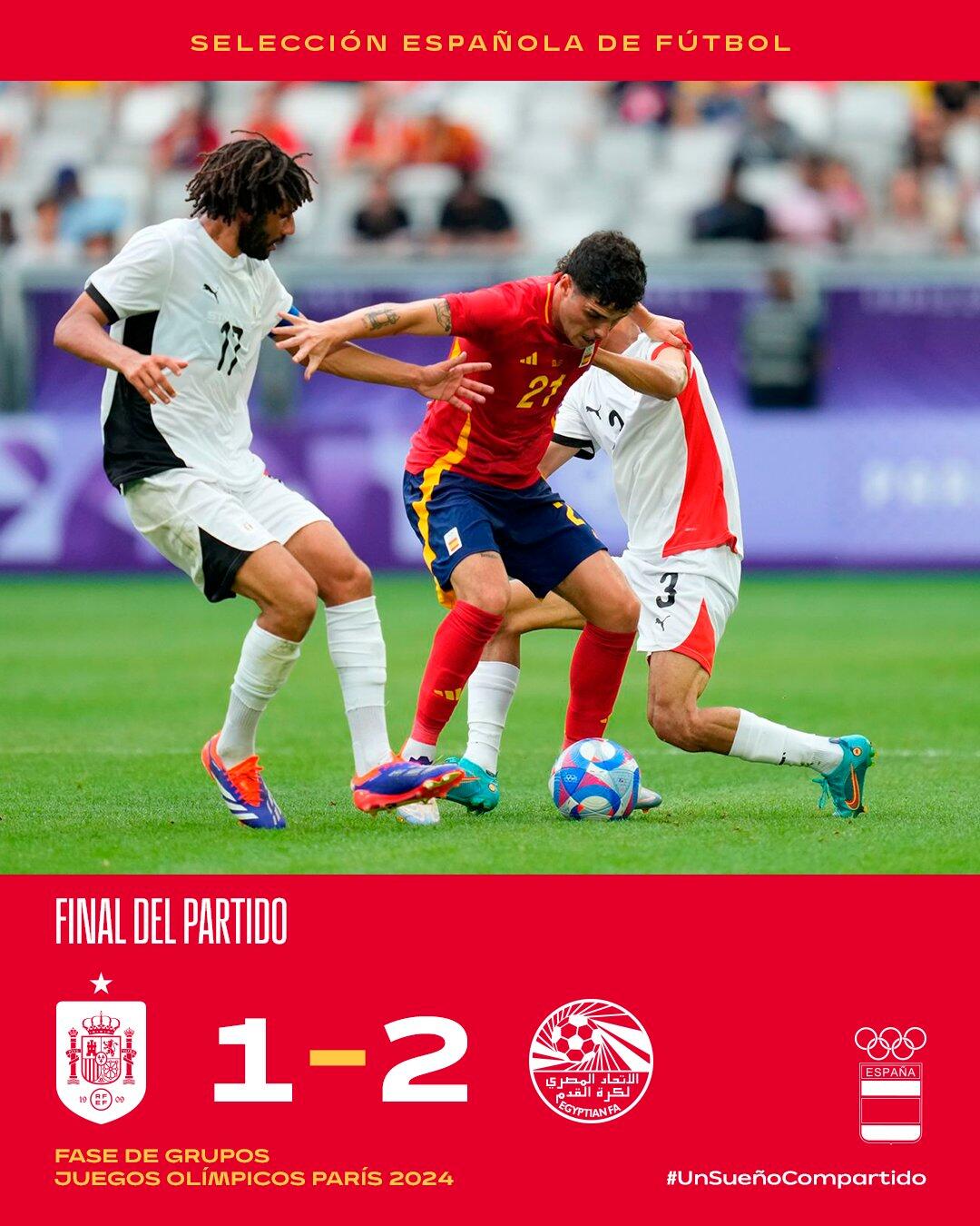 7月30日讯 北京时间7月30日晚上21:00,奥运男足小组赛C组第3轮,西班牙对阵埃及。上半场,易卜拉欣-阿德尔建功。下半场,阿德尔单刀梅开二度,奥莫罗迪翁头球破门。全场结束,西班牙1-2埃及。