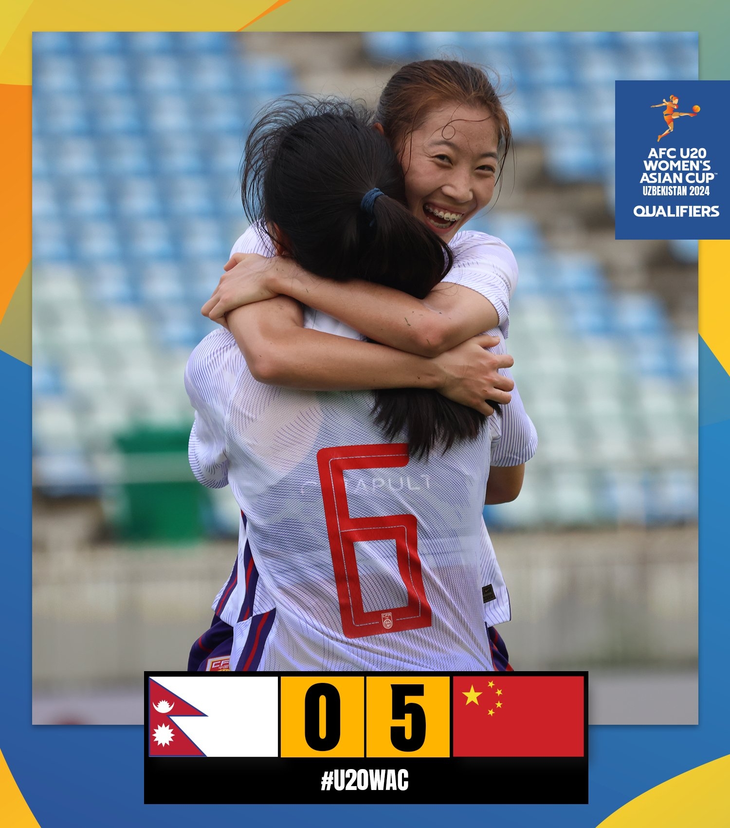 全场比赛结束,中国U20女足5-0击败尼泊尔女足。
