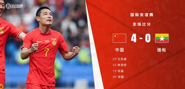 全场比赛结束,国足4-0击败缅甸。