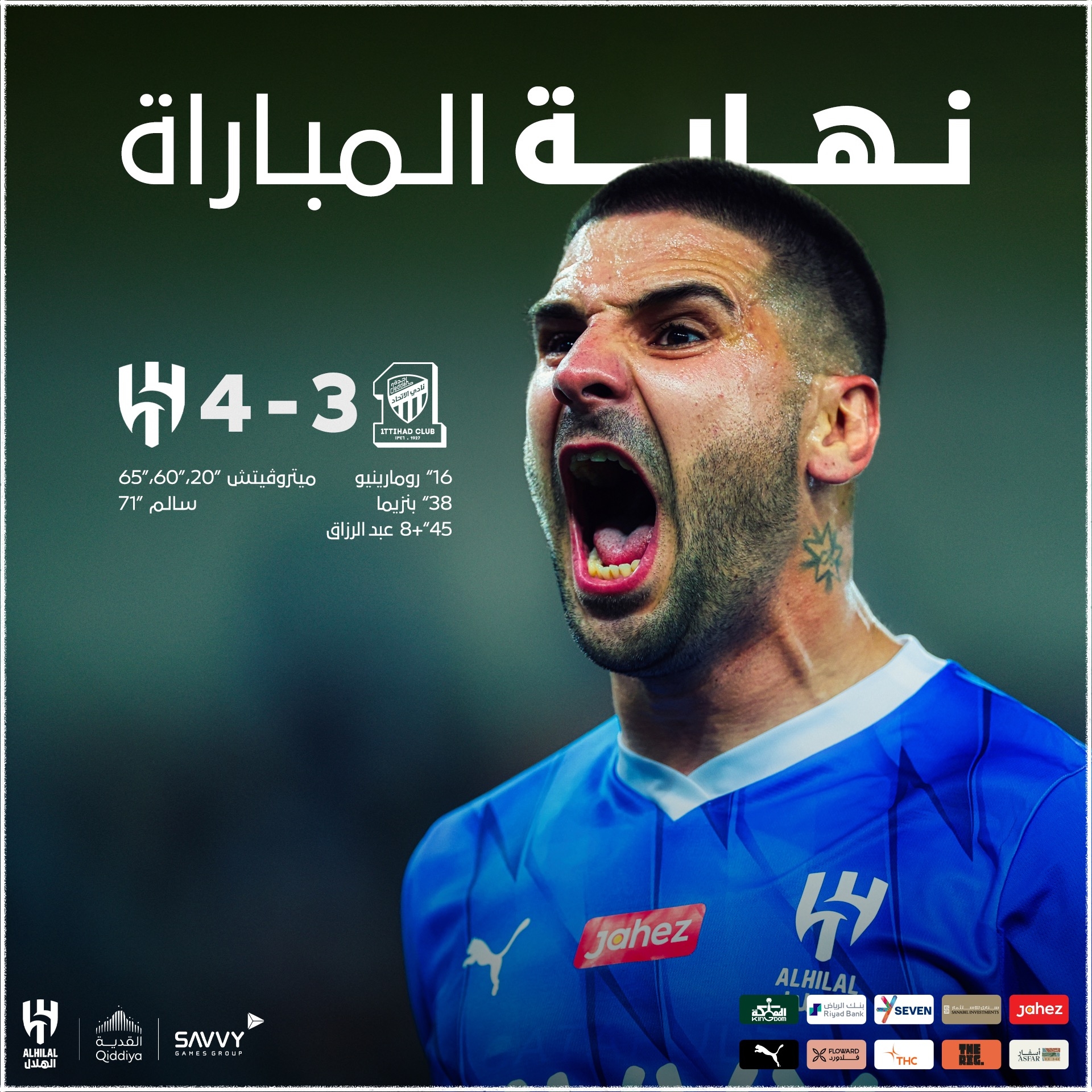吉达联合出场阵容:34-格罗赫、33-艾洛拉永(66’15-卡迪什)、20-沙拉希利、5-奥马尔-豪萨维(81’12-扎卡里亚)、28-巴沙特(66’13-沙恩奎特)、8-法比尼奥、7-坎特、10-科罗纳多(59’11-若塔)、90-罗马里尼奥(81’77-阿尔阿米里)、99-哈姆达拉、9-本泽马