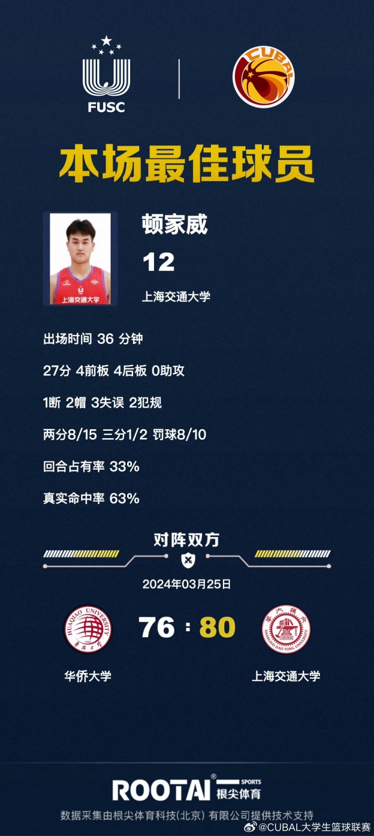 🏀CUBAL-顿家威27+8 陈天灿16+6 上海交大加时险胜华侨大学