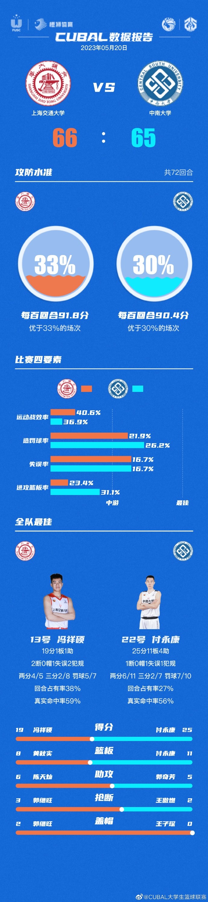 末节回来,上海交大连续杀伤禁区追平比分,中南大学则是在罚球线上取分重新建立领先,龚思成三分命中稳住局面,但冯祥硕站出来连得五分,郑晓垚上篮也进,上海交大在终场前两分钟反超2分,中南大学叫出暂停。调整回来龚思成三分再中,吴泽昊和郑晓垚上篮连续打进,龚思成打成2+1但罚球不中,中南大学依旧落后1分,吴泽昊被犯规后稳稳两罚全中,赵中兴打成快速两分但随后时间走完,全场比赛结束,上海交大66-65险胜中南大学,进入全国八强。