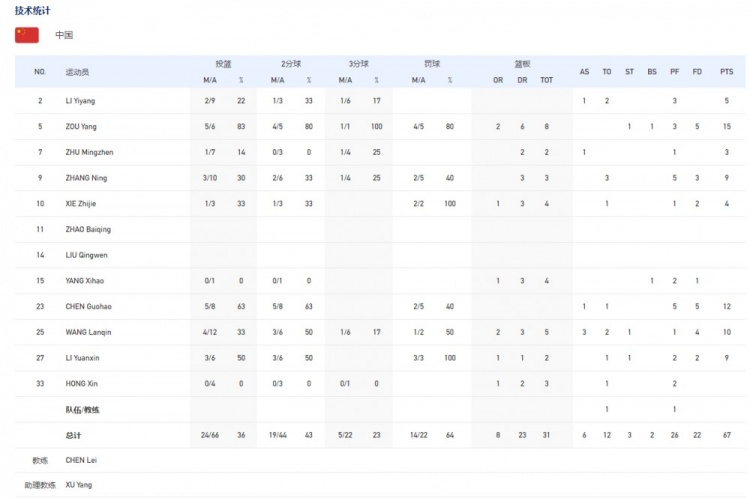 中国:邹阳15分8板1断1帽、陈国豪12分1助、黎伊扬5分1助、张宁9分3板、谢智杰4分4板、王岚嵚10分5板3助、李苑鑫9分2板。
