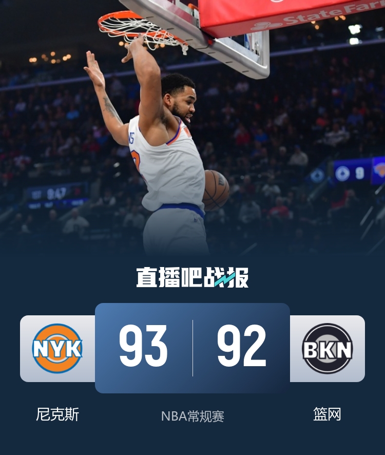 上半场,尼克斯开局慢热,连续打铁失误,反倒是篮网内外开花逐渐占据场上主动,米诺特还飙中压哨三分,次节尼克斯进攻回暖,轮番冲击内线连投带罚缩小分差,篮网稳扎稳打保持微弱优势,半场战罢篮网50-44领先尼克斯。下半场,尼克斯7-0完成反超,此后两队陷入缠斗,克拉克森三分引领球队11-0的攻击波取得两位数优势,末节篮网轰出17-0强势反超,尼克斯回敬8-0的攻击波夺回优势。篮网最后时刻落后1分,在仅剩1.5秒的情况下开球给后场,最终,尼克斯93-92险胜篮网。