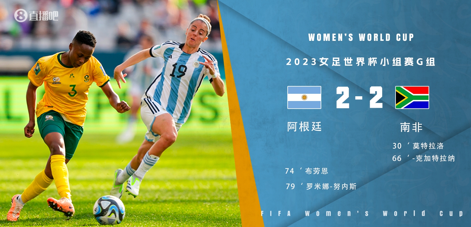 7月28日讯 北京时间7月28日08:00,女足世界杯小组赛G组第二轮阿根廷迎战南非的比赛,上半场雷菲洛-简伤退,克加特拉纳助攻莫特哈洛破门,半场结束,阿根廷女足0-1南非女足。下半场克加特拉纳推射建功,布劳恩世界波扳回一城,努涅斯头球扳平比分,最终阿根廷女足2-2南非女足。