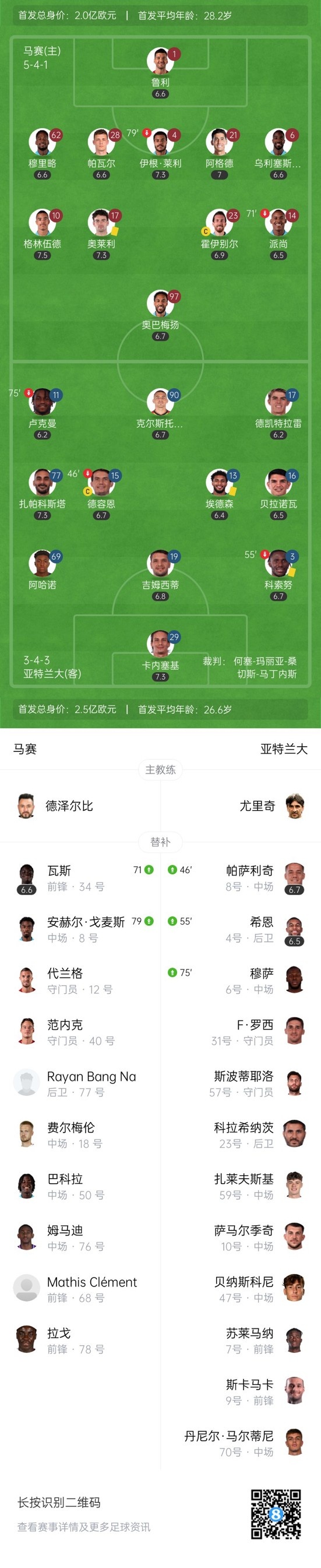下半场补时6分钟,马赛0-1亚特兰大。