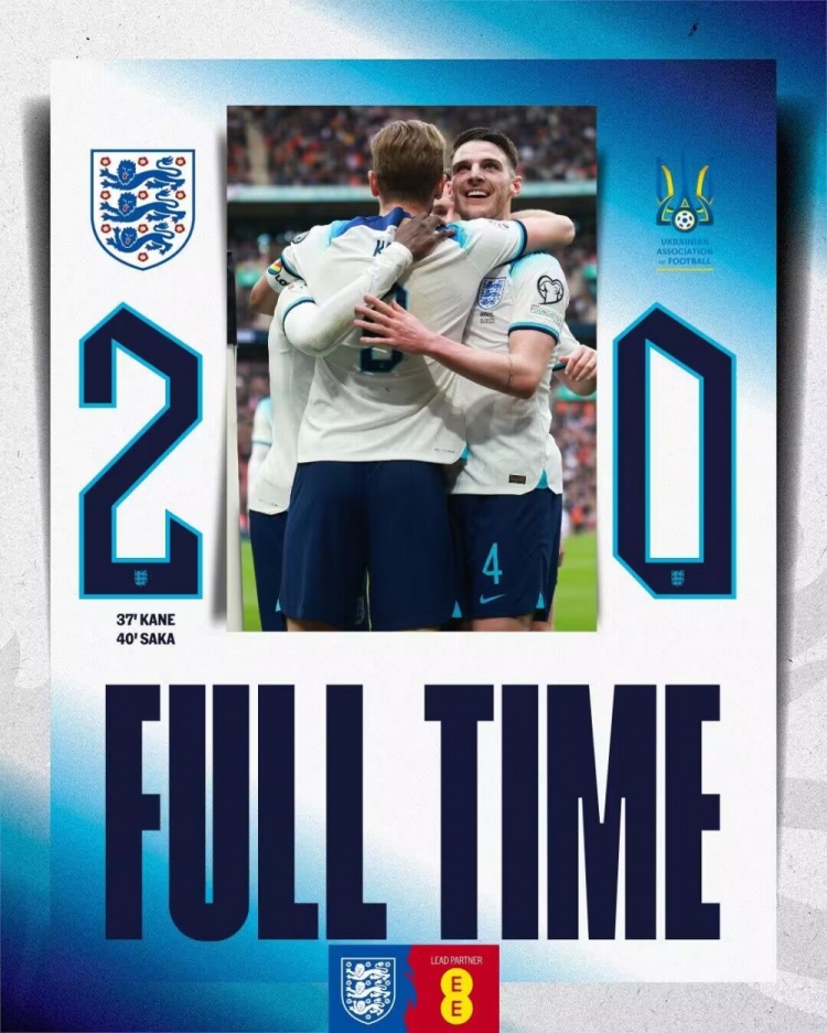 全场比赛结束,英格兰2-0乌克兰。