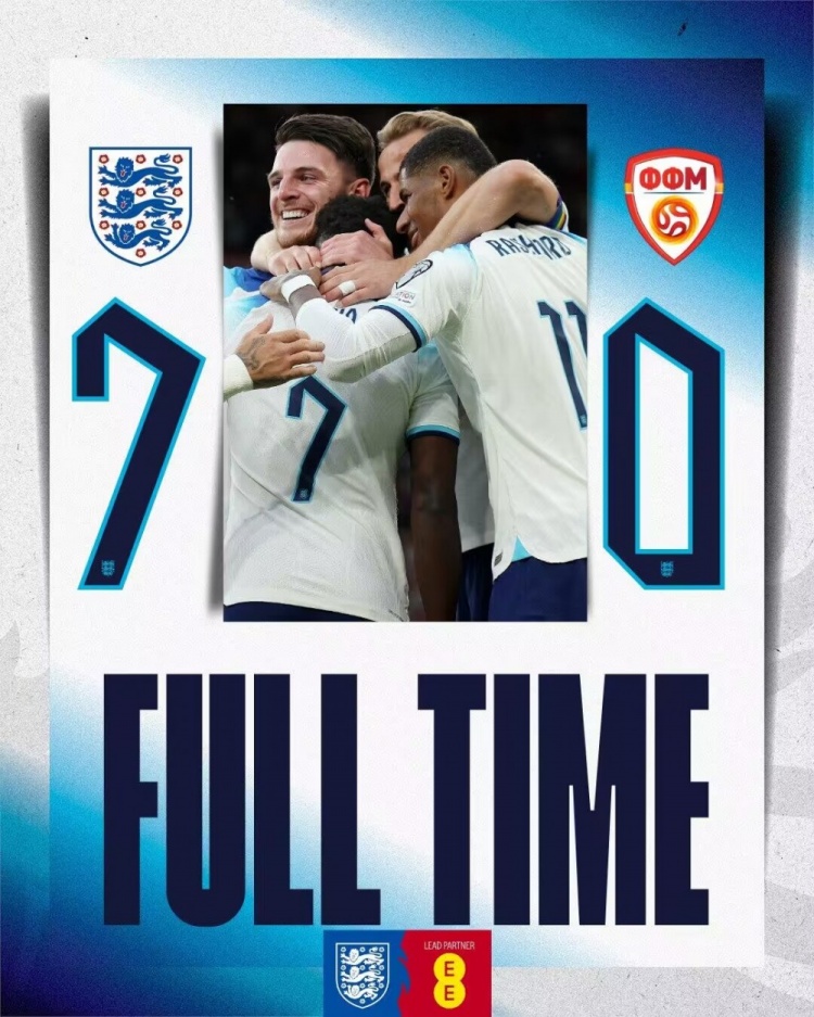 6月20日讯 北京时间6月20日凌晨2:45,欧洲杯预选赛第4轮,英格兰迎战北马其顿。上半场凯恩破门,萨卡再下一城,拉什福德建功;下半场萨卡4分钟时间双响,菲利普斯破门,凯恩点射,最终英格兰7-0北马其顿,4连胜继续领跑积分榜。