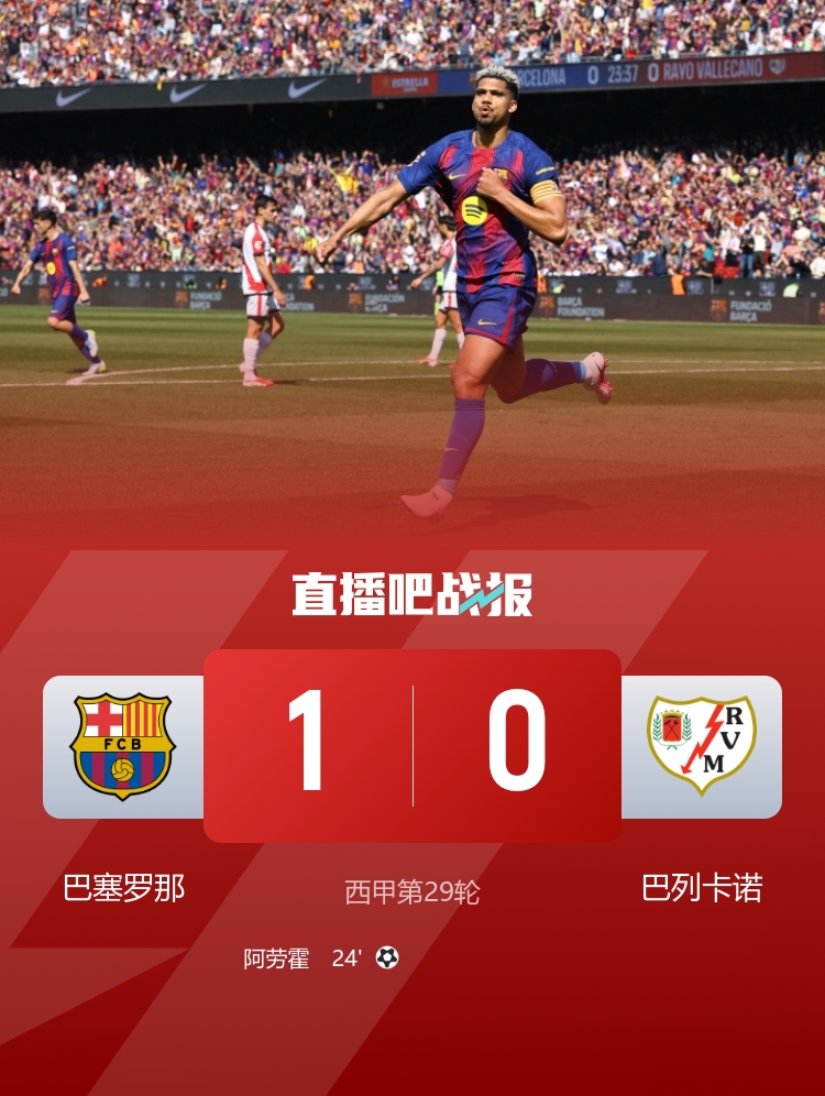 西甲5连胜!巴萨1-0巴列卡诺先赛7分领跑 阿劳霍制胜霍安屡神扑