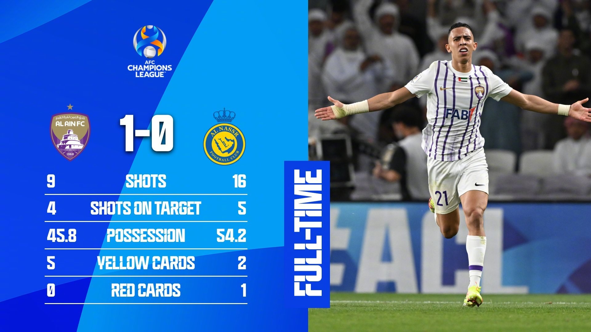 第44分钟,阿尔艾因反击送出直塞,拉希米单刀晃开奥斯皮纳打空门得手,阿尔艾因1-0利雅得胜利。↓