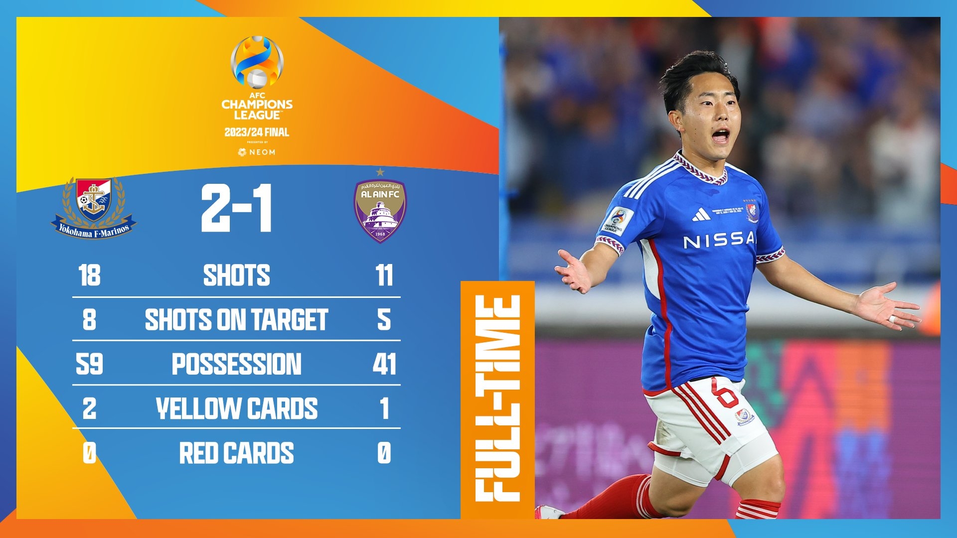 全场比赛结束,横滨水手2-1逆转阿尔艾因。