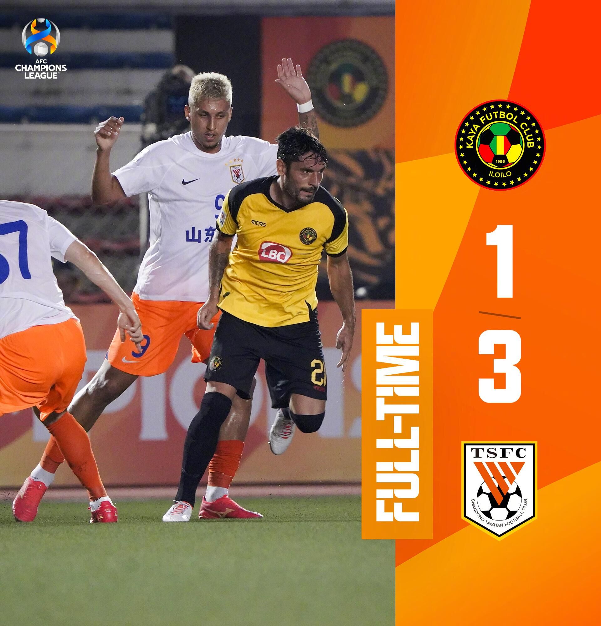 下半场补时6分钟。最终全场比赛结束,山东泰山3-1菲律宾卡雅。