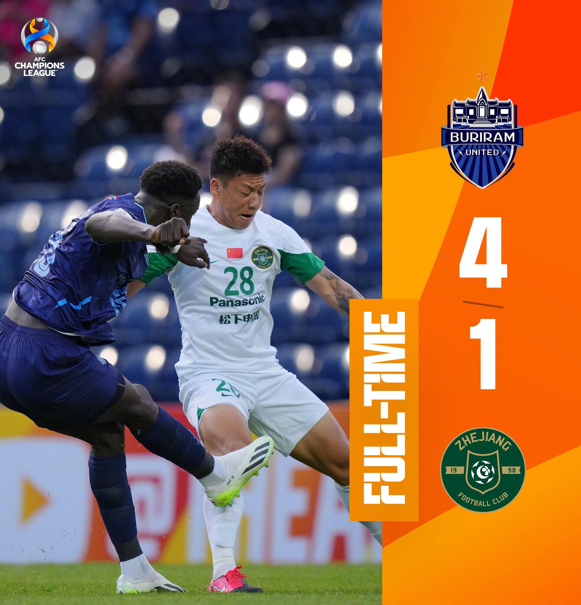 下半场补时5分钟。最终全场比赛结束,浙江队1-4武里南联。