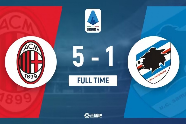 下半场没有伤停补时,全场比赛结束,AC米兰5-1桑普多利亚。