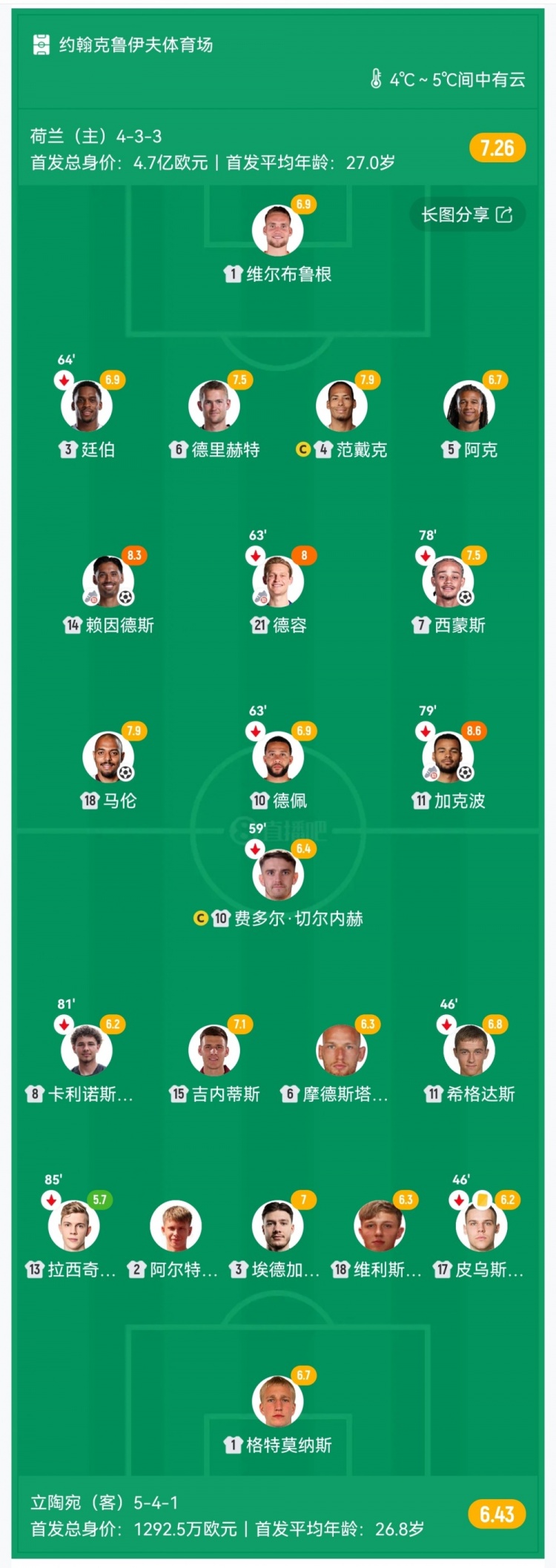 第16分钟,荷兰队前场反抢成功,德容顺势送出直塞,禁区右侧赖因德斯跟进射门入网,荷兰1-0领先↓