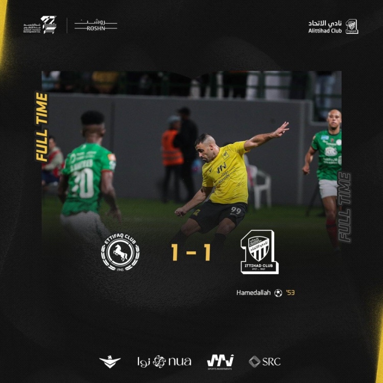 吉达联合首发:34-格罗赫、15-卡德什、5-路易斯-费利佩、25-曼哈利(68'17-阿尔萨哈菲)、13-山凯蒂、28-巴沙特、8-法比尼奥、16-加姆迪、10-科罗纳多、99-哈姆达拉(68'77-阿尔阿米里)、9-本泽马