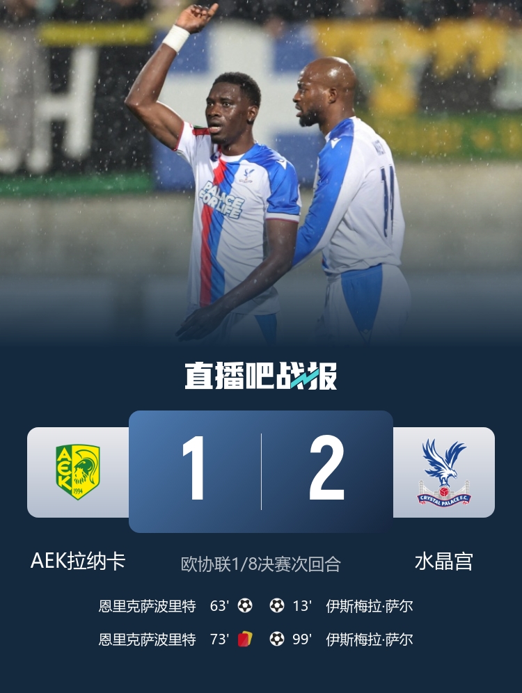 将战佛罗伦萨!水晶宫加时2-1九人AEK拉纳卡进欧协联8强 萨尔双响