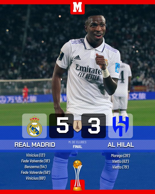 2月12日讯 北京时间2月12日凌晨3点整,2023年世俱杯决赛在摩洛哥展开角逐,皇家马德里对阵利雅得新月。上半场维尼修斯和巴尔韦德先后建功,马雷加扳回一城,下半场本泽马和巴尔韦德扩大比分,维尼修斯完成两射一传,维耶托连扳两球。最终皇家马德里5-3战胜利雅得新月,皇马队史第5次夺得世俱杯冠军,俱乐部冠军数达到100座。