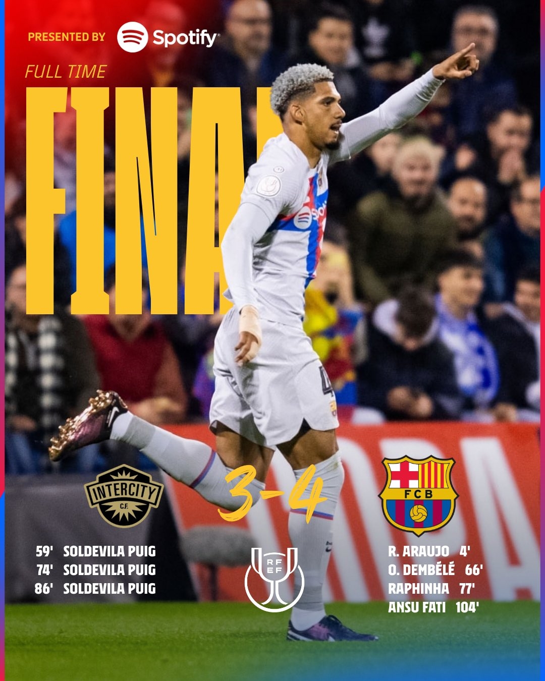 1月5日讯北京时间1月5日凌晨4:00,国王杯1/16决赛,城际CF对阵巴塞罗那。上半场,阿劳霍头球破门为巴萨首开纪录!下半场,奥利奥上演帽子戏法三度扳平比分,登贝莱、拉菲尼亚破门。常规时间双方战成3-3,进入加时赛。加时赛上半场最后时刻法蒂破门再次超出比分!巴塞罗那4-3城际CF晋级下一轮!