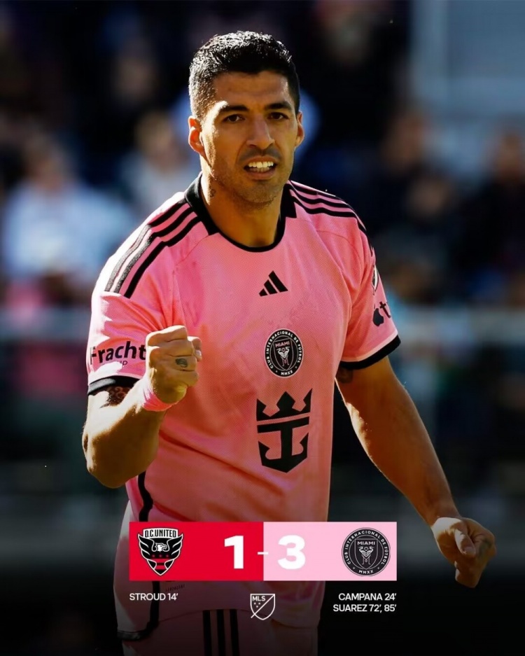 苏神梅开二度!第85分钟,戈麦斯中场断球推进后横传,苏亚雷斯晃开角度起脚吊射,波诺扑救不及皮球越过门线,华盛顿联1-3迈阿密国际!↓