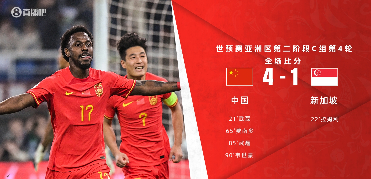 3月26日讯 北京时间3月26日晚20时整,世预赛亚洲区第二阶段C组第4轮在天津奥体中心体育场展开角逐,中国男足坐镇主场迎战新加坡。上半场武磊单刀建功后失良机,刘洋犯罪式漏人送新加坡秒扳平,张玉宁失空门&送助攻,下半场费南多点射迎首球,武磊2射1传&染黄下轮对阵泰国将停赛,李源一染红也将停赛,韦世豪替补破门。最终中国男足主场4-1战胜新加坡,C组积分榜方面,国足积7分升至第2名,领先第3名泰国3分。