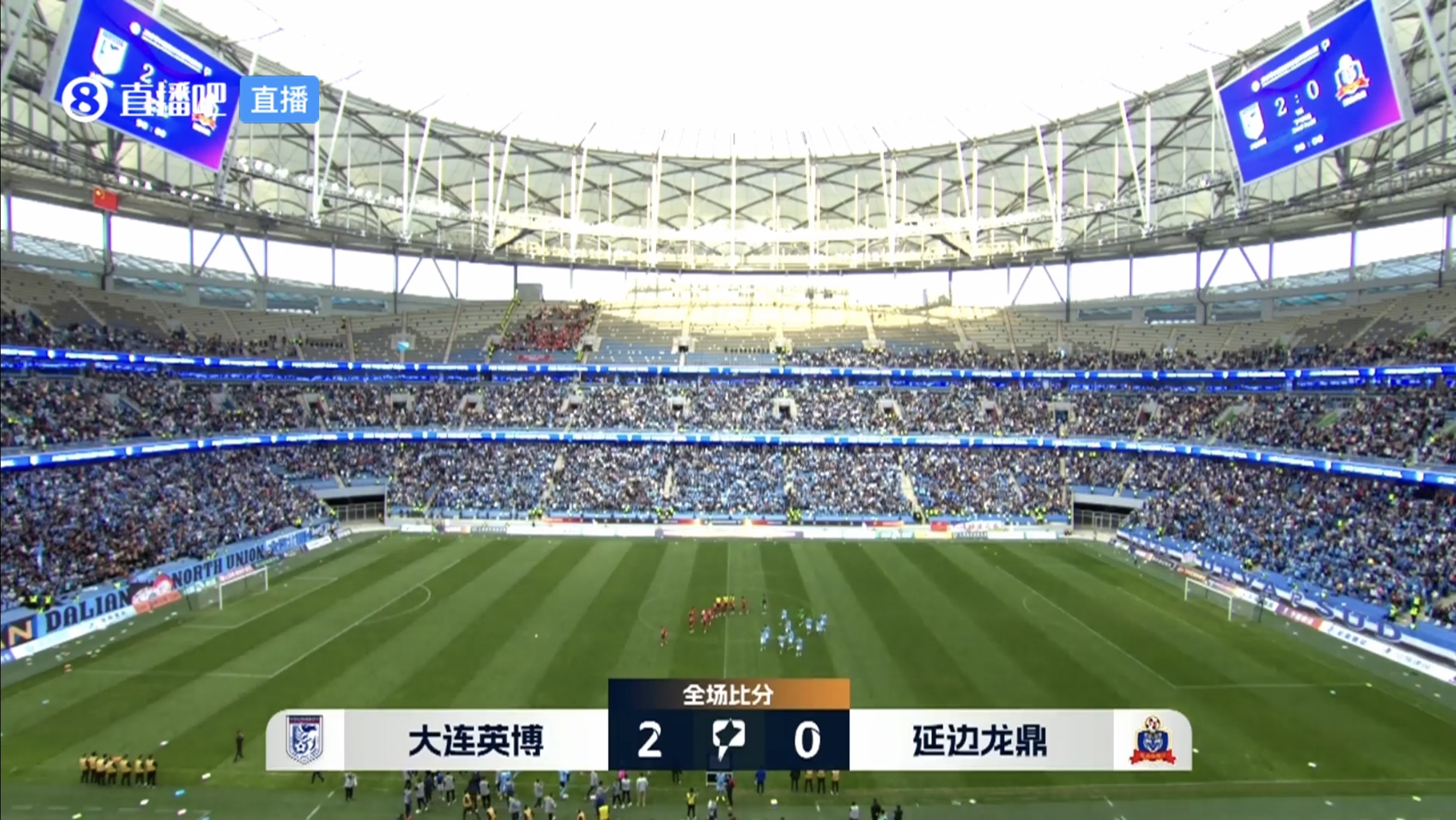 伤停补时7分钟。全场比赛结束,大连英博2-0延边龙鼎。