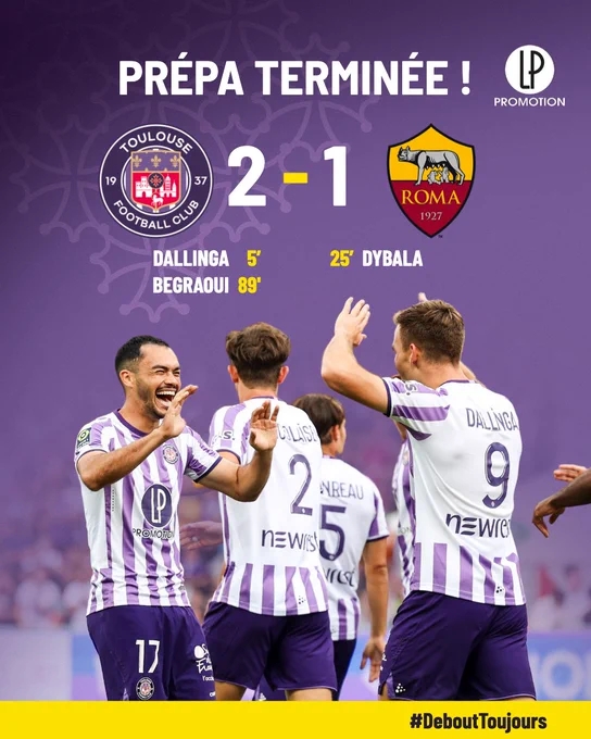 友谊赛-罗马遭绝杀1-2图卢兹,迪巴拉任意球死角破门