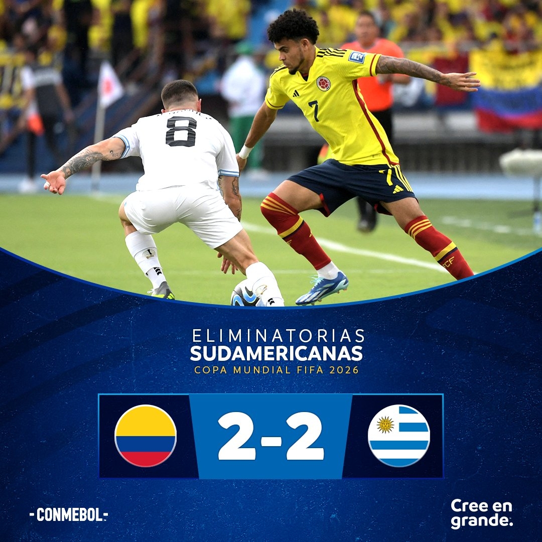 第87分钟,哥伦比亚门将卡米洛-巴尔加斯出击放倒阿劳约,两黄变一红+送点,努涅斯第90+1分钟点射绝平,乌拉圭2-2哥伦比亚↓